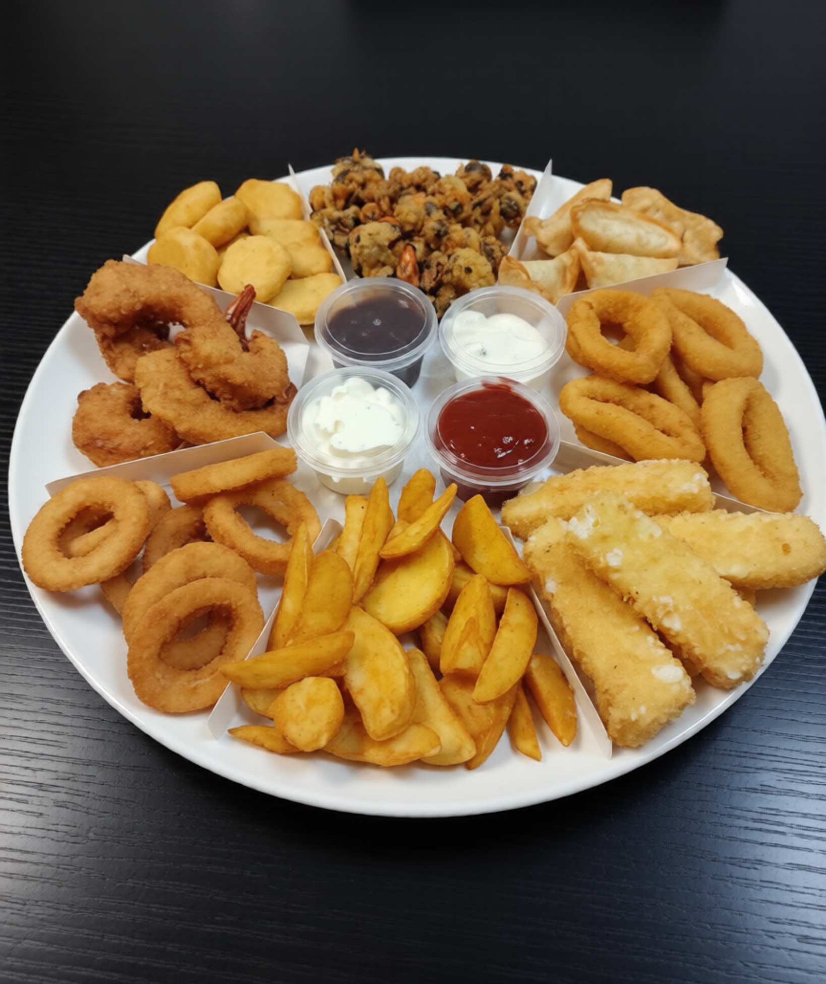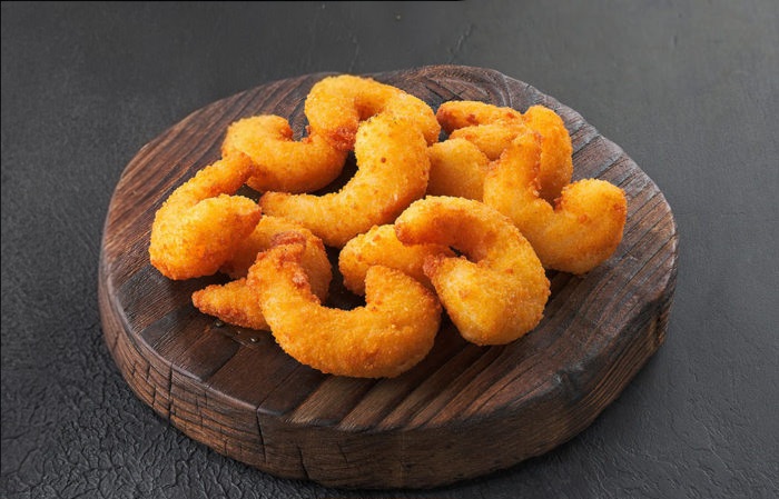 нагетсы, мидии, пельмени Гедзе, кольца кальмара, креветки, луковые кольца, картошка по деревенски, сырные палочки.